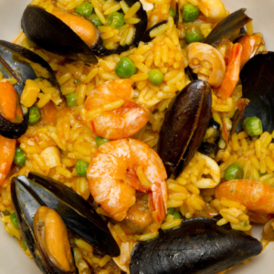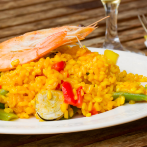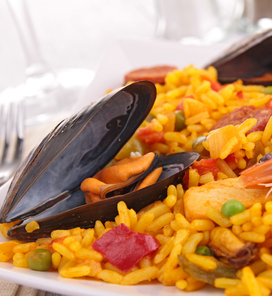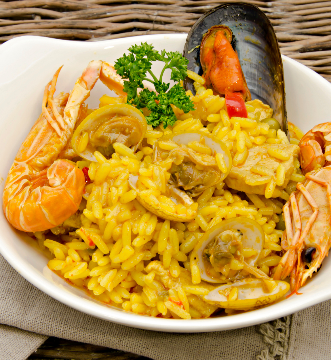 Es una fusión perfecta de mar y tierra. Jugosos trozos de pollo y cerdo con camarón, calamar, jaiba, mejillones y embutidos. Todo cocido lentamente en un fondo de caldo casero con arroz, azafrán y verduras frescas.